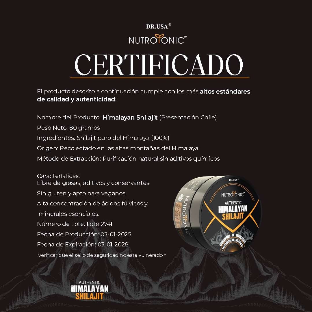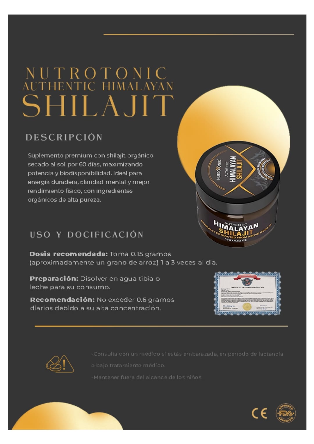 Himalayan Shilajit es un suplemento en resina de alta calidad, obtenido éticamente a 17,000 pies de altura. Su dosis recomendada de 0,15 g disuelta en agua contribuye a eliminar toxinas, aumentar la energía y relajar la mente. Enriquecido con ácido fúlvico y minerales esenciales, potencia la vitalidad y ayuda a manejar el estrés, promoviendo un equilibrio físico y mental óptimo.